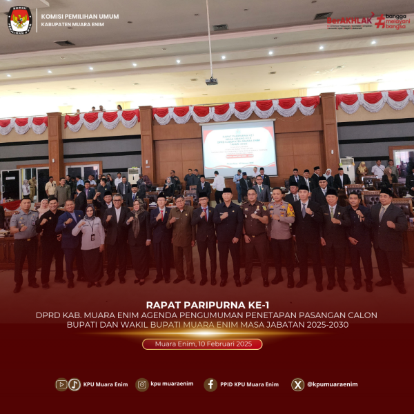 #TemanPemilih, Ketua KPU Kabupaten Muara Enim Ibu Rohani, SH, Anggota KPU Divisi Perencanaan Data dan Informasi Bpk. Fadlin M. Amien, SH dan Sekretaris KPU Kabupaten Muara Enim Bpk. Ramadansyah, S.IP,. M.Si Hadiri Rapat Paripurna ke- 1 dengan Agenda Pengumuman dan Penandatanganan Berita Acara Penetapan Pasangan Calon Bupati dan Wakil Bupati Muara Enim Masa Jabatan 2025-2030 di Gedung DPRD Kabupaten Muara Enim. Senin, 10 Februari 2025