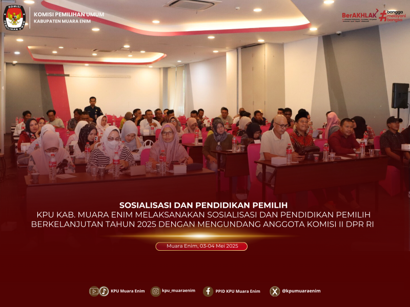 #TemanPemilih, KPU Kabupaten Muara Enim Menjadi Fasilitator dalam Melaksanakan Sosialisasi dan Pendidikan Pemilih Berkelanjutan Tahun 2025 dengan dihadiri Anggota Komisi II DPR RI, Sabtu-Minggu 03-04 Mei 2025 bertempat di Fave Hotel Prabumulih